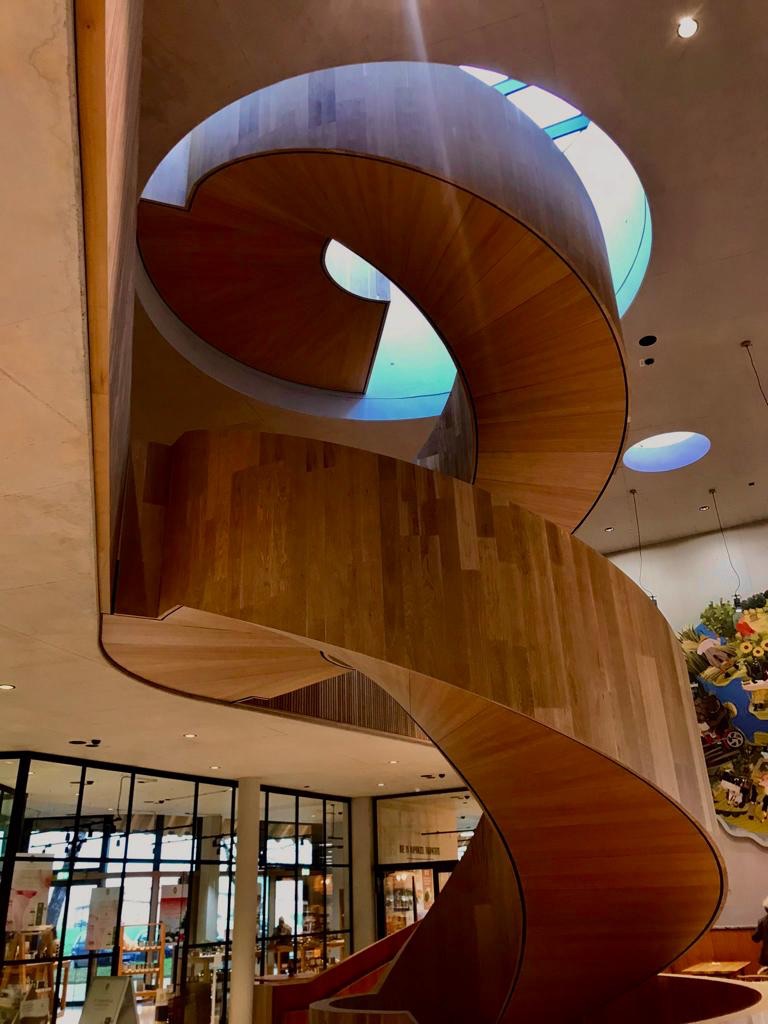 Im Oktober 2022 eröffnete das Unternehmen Rapunzel seine neue Erlebniswelt für Jung und Alt in Legau. Ein einzigartiger Blickfang des Besucherzentrums ist dabei die frei tragende Wendeltreppe im Foyer. Wir haben zusammen mit den BIGA-Bauingenieuren und dem Treppenbauer HOKON aus Witten ermöglicht, dass die Tragkonstruktion komplett aus Holz besteht und somit den Nachhaltigkeitsgedanken des Bauherrn prominent repräsentiert.